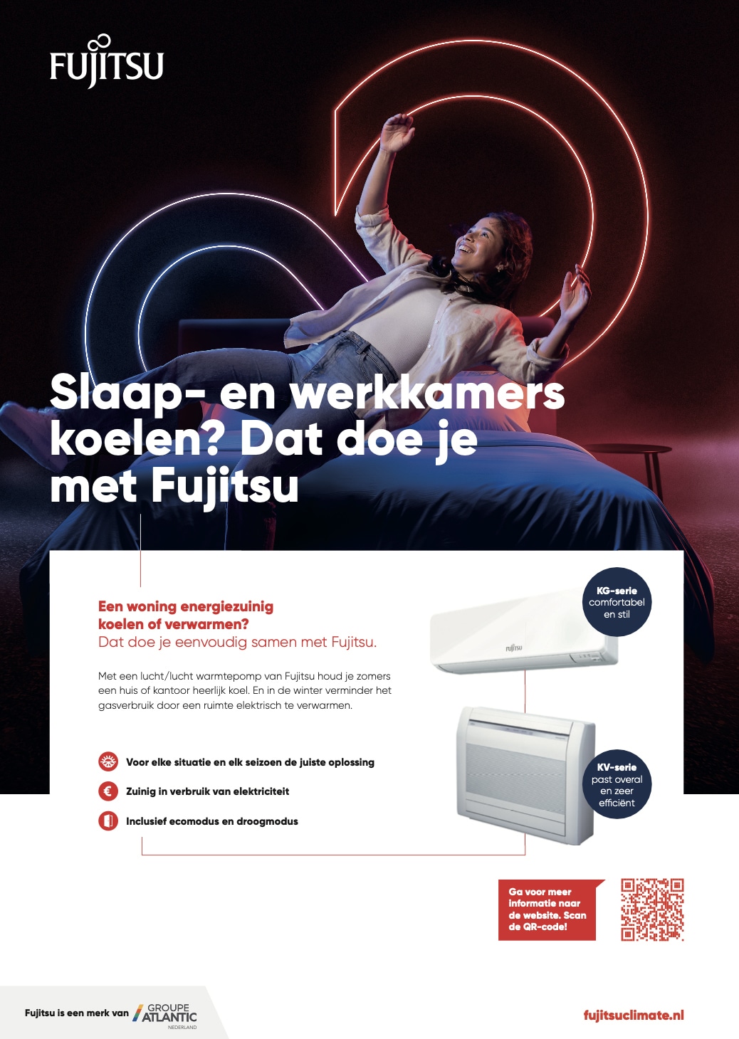Met de lucht/lucht warmtepompen van Atlantic-Fujitsu kun je het hele jaar door op duurzame wijze een woning koelen of verwarmen. De AircoHeaters van Atlantic-Fujitsu zijn zeer zuinig in het verbruik van elektriciteit. Een slaapkamer verkoelen met een hoog-aan-de-wand unit kan al voor € 27,- per zomer.* En in de winter geeft het de extra mogelijkheid om een ruimte te verwarmen.